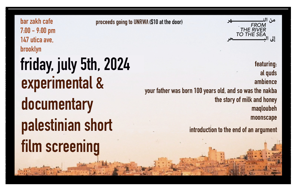 Welcome to our Experimental and Documentary Palestinian Short Film Screening at Bar Zakh! Join us for a captivating evening filled with thought-provoking films that shed light on Palestinian resistance and experiences with occupation. Immerse yourself in a diverse selection of short films that challenge traditional storytelling methods. This is a fantastic opportunity to engage with Palestinian cinema and filmmakers. All proceeds are being donated to UNRWA.